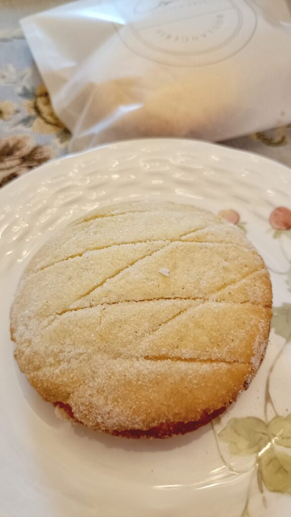 これぞメロンパン!と言える、しっかりしたクッキー生地、上に散りばめられたシュガーに、バニラビーンズの香り!